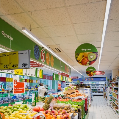 - Установлены светильники ALU-MAXi-SP длиной 2,8м с модулями LED Line SMD-Kit для общего освещения в торговом зале, подсветки зоны касс и овощей.