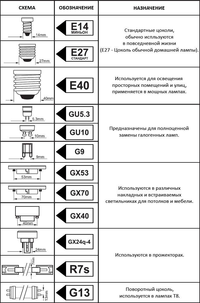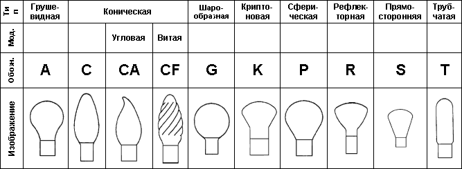 Основные виды светодиодных ламп и их общепринятые обозначения