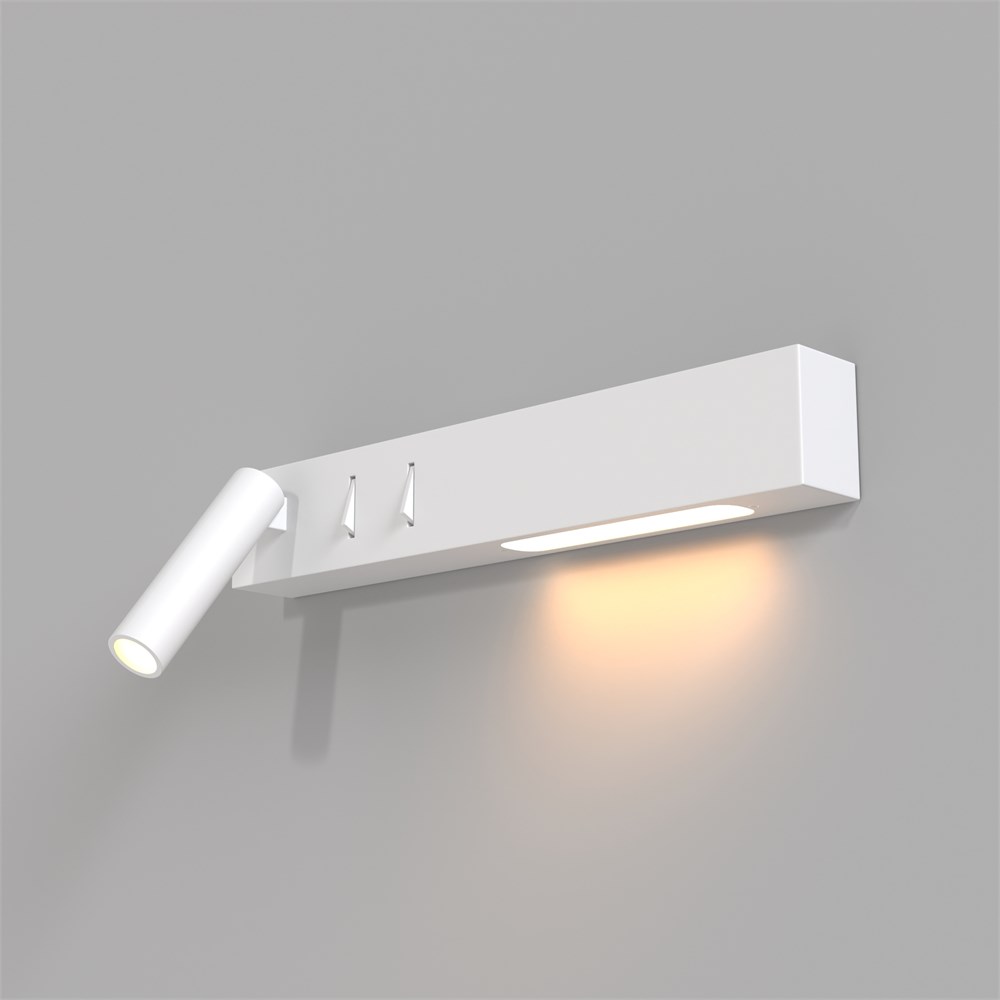 Настенные прикроватные светильники с двумя встроенными источниками света. Локальная подсветка позволит осветить книгу или журнал, а рассеянная создаст атмосферу непринужденности. Светильник управляется выключателями, расположенными на корпусе. В качестве обоих источников света использованы встроенные светодиоды теплого спектра.