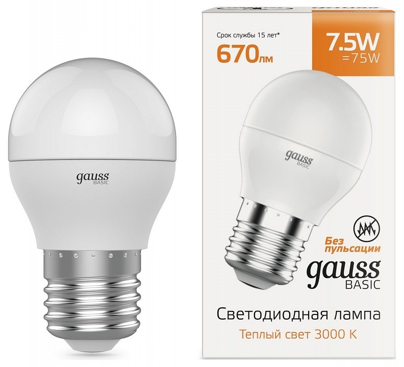 Лампа Gauss Basic Шар 7,5W 670lm 3000K E27 LED 1/10/100