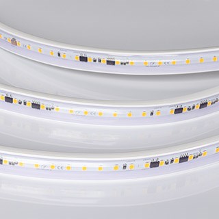 Светодиодная герметичная лента ARL серии A120 со степенью защиты IP65, защитная оболочка из ПВХ устойчива к УФ излучению, что позволяет использовать ее на улице. Высокий индекс цветопередачи CRI>85 обеспечивает точное восприятие цветовых оттенков. Лента подключается непосредственно к сети переменного тока 230 В и не требует использования источников питания. Наличие интегральных стабилизаторов тока позволяет подключать ленту длиной до 50 м, обеспечивая при этом равномерную яркость свечения по всей длине ленты. При подключении нескольких лент необходимо подавать питание на каждые 50 м отдельным кабелем, последовательное подключение лент более 50 м запрещается. Лента применяется для подсветки потолочных ниш, декоративной подсветки, создания контуров рекламных объектов, может использоваться в помещениях и на улице. На лентах установлены микросхемы с функцией снижения тока для защиты ленты от перегрева, обеспечивающие надежную работу в различных условиях. Диммирование в диапазоне 30%-90% осуществляется TRIAC димме