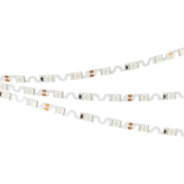 Гибкая лента с фигурной платой в форме волны, легко изгибается на плоскости. Светодиоды smd 5060, 48шт/м (240шт на 5м), белая плата 6,1мм, скотч 3М. Цвет ЗЕЛЕНЫЙ. Питание 12В, мощность 11,5 Вт/м (57,5 Вт на 5м). Размеры 5000х6,1х2,2мм. Мин.отрезок 63мм (3