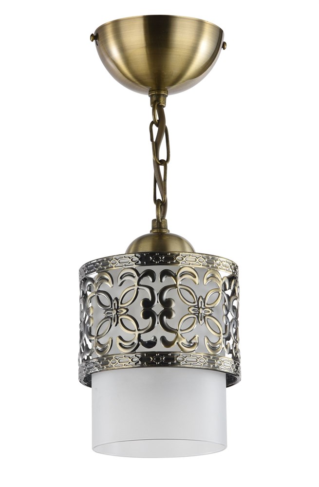 Подвес имеет два плафона: плафон из матового стекла и декоративный металлический плафон с ажурным узором и фигурной чеканкой на ободке. Цвета арматуры и металлического декоративного плафона - французское золото, античная бронза и белый с золотистым патинированием.