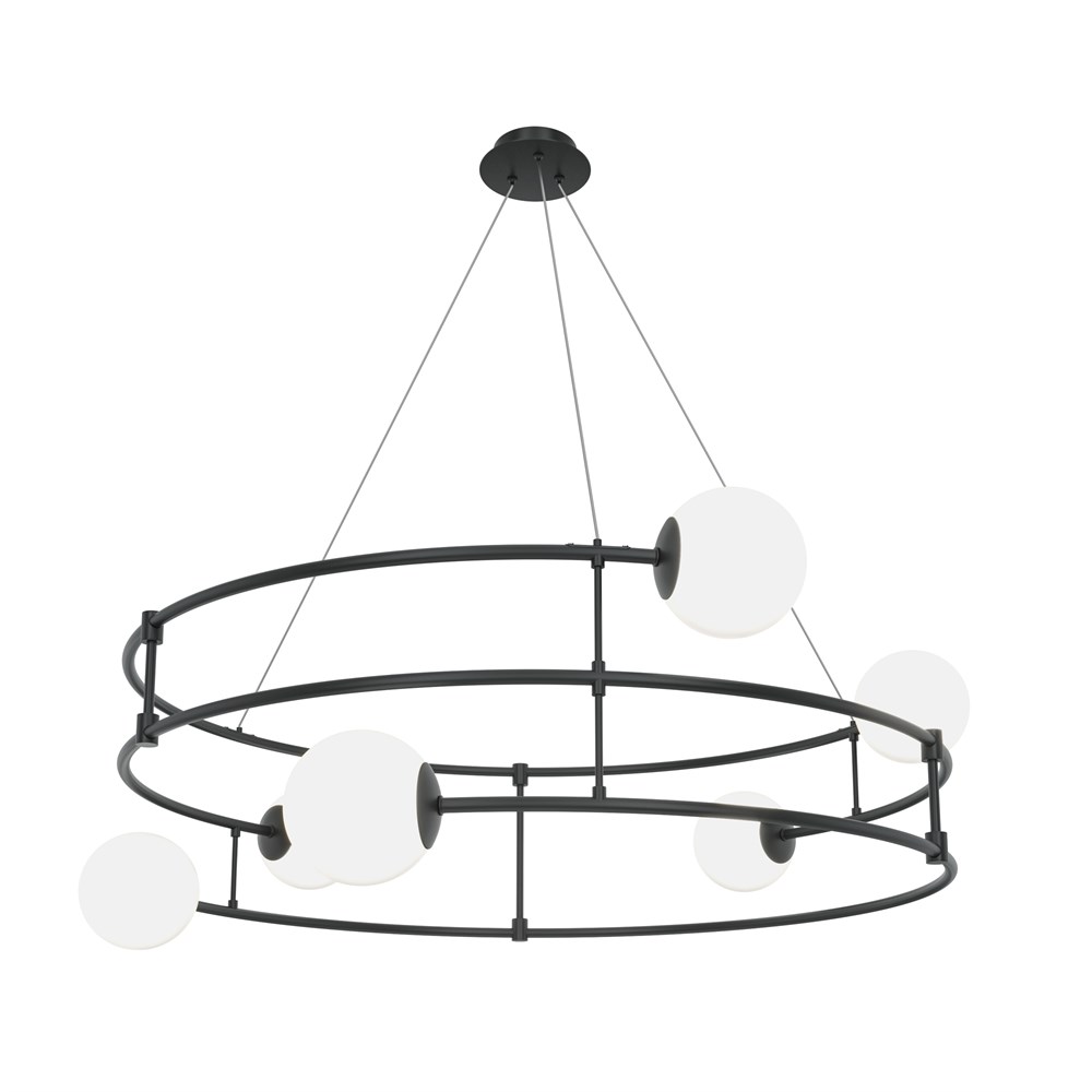 Арматура из металла в двух оттенках: черный и золото. Плафоны из матового выдувного стекла крепятся к металлическим дугам. Высота регулируется с помощью тросов.