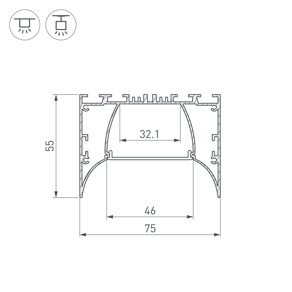 Габаритные размеры профиля составляют 2000 мм в длину, 75 мм в ширину и 55 мм в высоту. Площадка для установки светодиодных лент позволяет использовать ленту шириной до 32 мм и мощностью до 68 Вт/м. Это обеспечивает гибкость в выборе светодиодных лент и создает потрясающие световые решения.