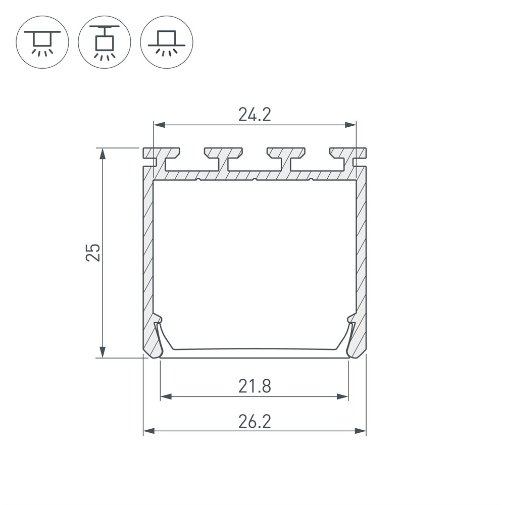 Габаритные размеры профиля составляют 3000 мм в длину, 26 мм в ширину и 25 мм в высоту. Площадка для установки светодиодных лент позволяет использовать ленту шириной до 24 мм и мощностью до 26,2 Вт/м. Это обеспечивает гибкость в выборе светодиодных лент и создает потрясающие световые решения.