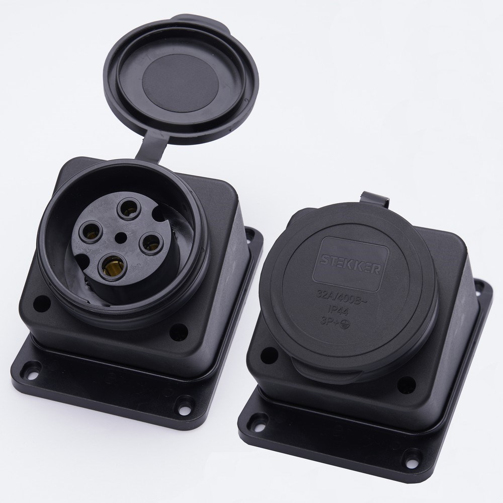 Розетка STEKKER RST32-31-44 (расстояние между монтажными отверстиями: по гориз. - 73мм, по вертик.- 118мм) на 1 гнездо, с крышкой, с заземлением. Материал: каучук, цвет черный, размер 116*87*114мм. Номинальное напряжение 400В, номинальный ток 32А, диапазон рабочих температур -10..+35°C, IP44