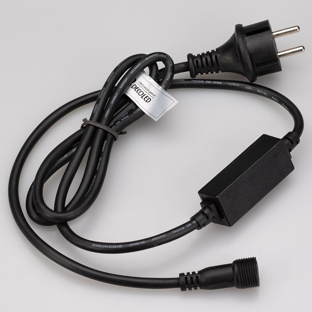 Шнур питания специально разработан для подключения светодиодных гирлянд с эффектом мерцания (FLASH). В комплект входит шнур питания с вилкой европейского стандарта (IP44), 2pin разъем для подключения к гирлянде, а также выпрямитель AC/DC (1.6А). Оболочка из черного каучука придает ему элегантный внешний вид. Длина провода составляет 1,5 метра, что позволяет удобно располагать гирлянду.