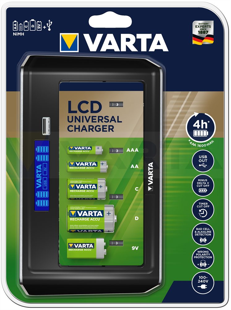 Заряжает аккумуляторы типоразмеров AA/AAA/C/D и 9V